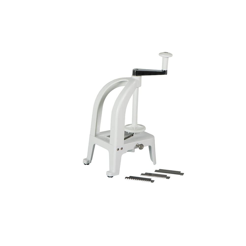 • 4 verschiedene Klingen (gerade Schneide, grobe, mittlere und feine Zahnung); Machen Sie breite Scheiben, grobe Schnitte, lange schmale und extraschmale Julienne-Streifen