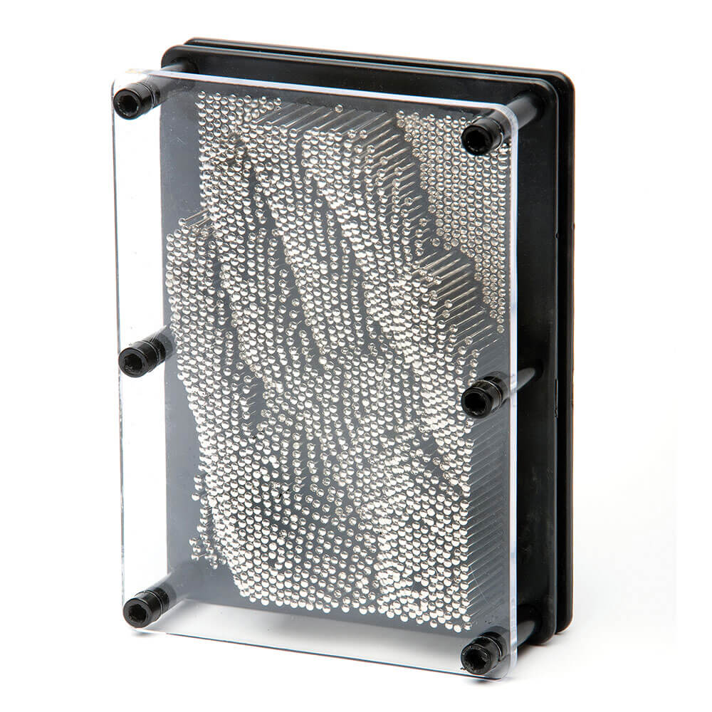 Heben Sie das Gerät an Ihr Gesicht - oder an einen anderen geeigneten Teil Ihrer Anatomie und drücken Sie sanft auf die Tausenden von Metallstiften, um einen perfekten 3D-Abdruck hinter einer Plexiglasplatte zu erhalten.
