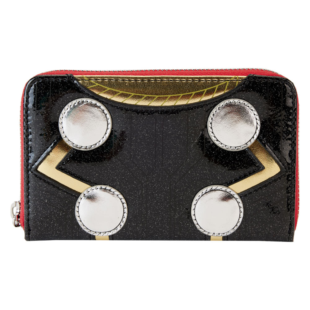 Das Loungefly Marvel Metallic Thor Cosplay -Reißverschluss in der Brieftasche besteht aus veganem Leder (Polyurethan). Brieftasche mit glänzenden silbernen Hardware geschlossen. Weitere Funktionen sind Applikat, Debossed, Glitzer und gedruckte Details. Beachten Sie die Koordinierung in der Inneren.