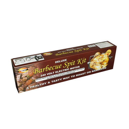 Deluxe Grillspieß-Kit. Der Elektromotor ist für 12,5 kg ausgelegt und verfügt über einen Hitzeschild aus Edelstahl und einen automatischen Rückwärtsgang zum Schutz vor Überlastung. Passend für die meisten Haubengrills mit 3 bis 6 Brennern