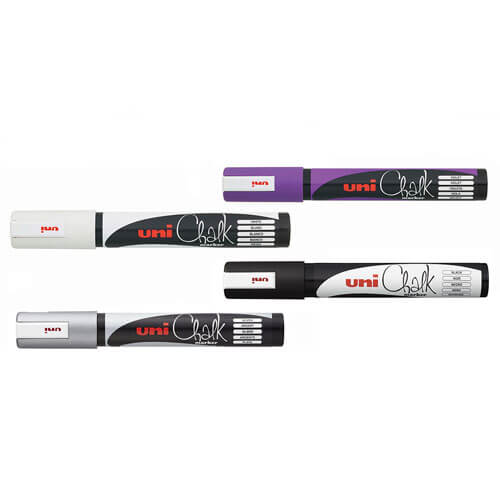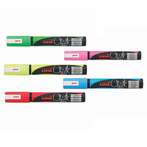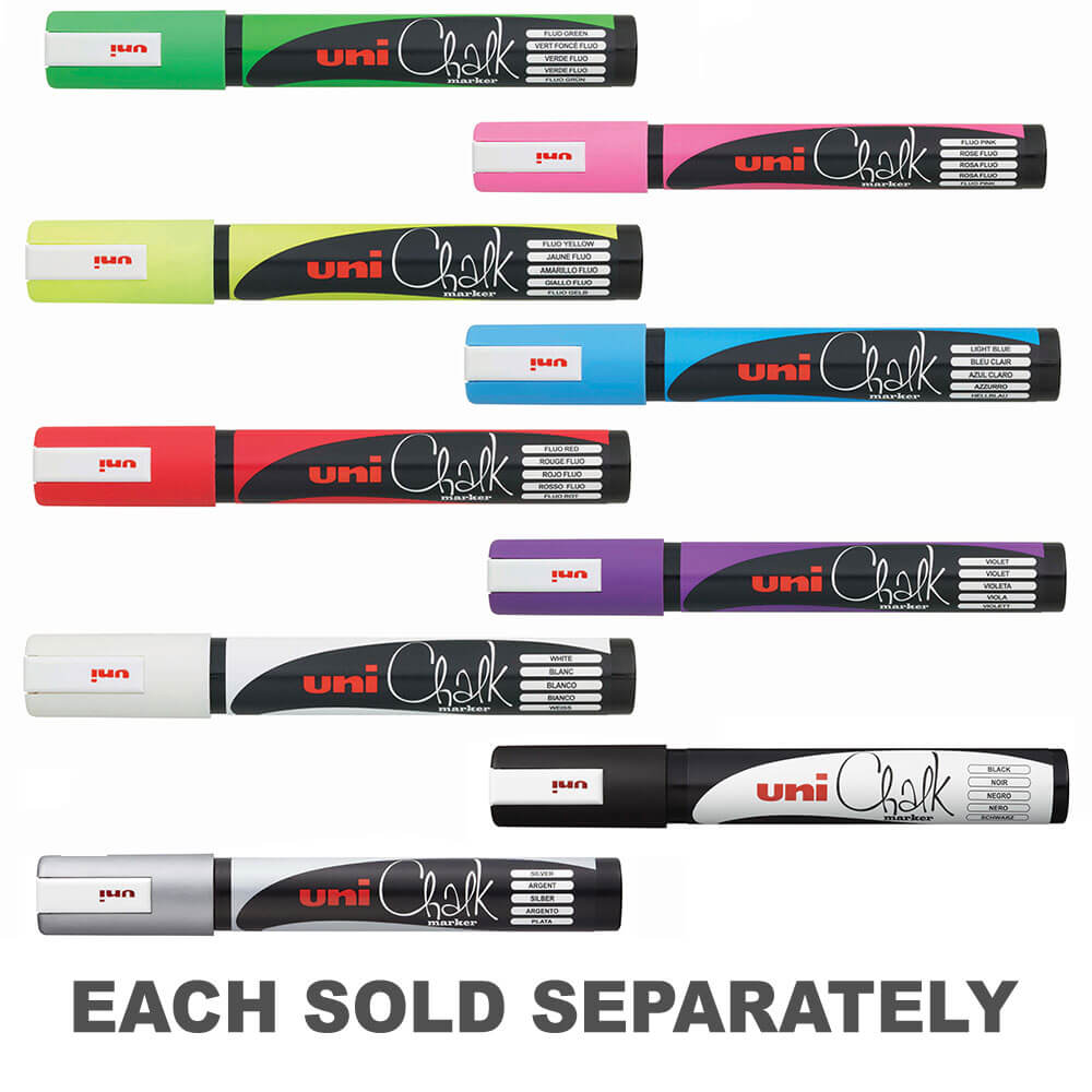 Uni Liquid Chalk Markers verwenden Pigmenttinte auf Wasserbasis, sodass Sie problemlos auf Fenstern, Glas, Spiegeln, Kunststoff- und Metalloberflächen markieren können. Die Tinte wäscht sich im Regen nicht ab, lässt sich aber leicht mit einem feuchten Tuch entfernen. Zur dauerhaften Anwendung können die Marker auch auf Kreidetafeln verwendet werden, um ein auffälliges Statement zu setzen.