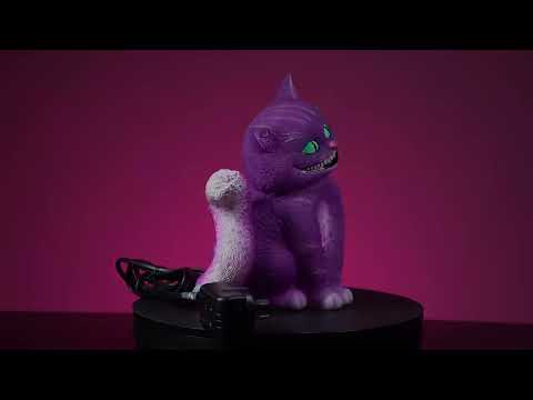 • LED-Tischlampe mit einer grinsenden verrückten Katze und leuchtend türkisfarbenen Augen