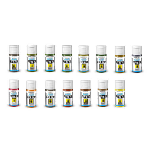 AMMO's new acrylic filters are designed to be applied directly to the model. This new range allows you to add colour variation to your miniatures, harmonize various camouflage colours, or distinguish areas with a different tone. The acrylic filter can be easily applied with a brush, which avoids the need for complicated masking. Moisten the brush with the product and apply it without flooding the surface. Thanks to the innovative formulation, the Acrylic Filters can be retouched or eliminated simply and easily with water during the extended dry time, each filter will dry completely in 24 hours. These versatile filters can also be applied by airbrush for an endless number of effects. Thanks to the wide range of 30 colours available, you won´t need to make complex mixtures, adjust for the proper thinning ratio, or adjust the tone to the intended shade. Each colour can be mixed with one another, or tinted with other AMMO acrylics. The acrylic filters can be diluted and cleaned with wat