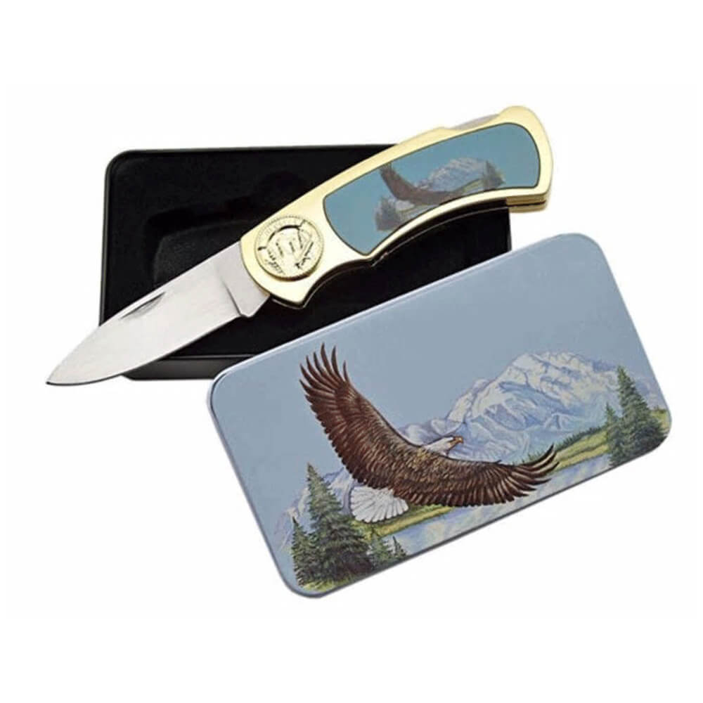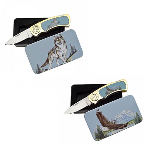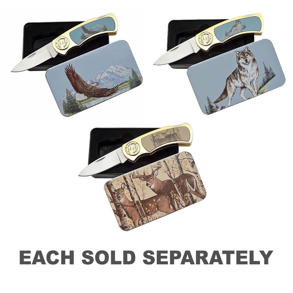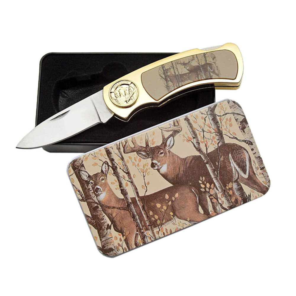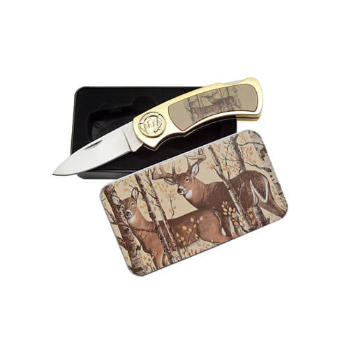 Features doe and deer picture inlay in handle. Complete with display tin.
