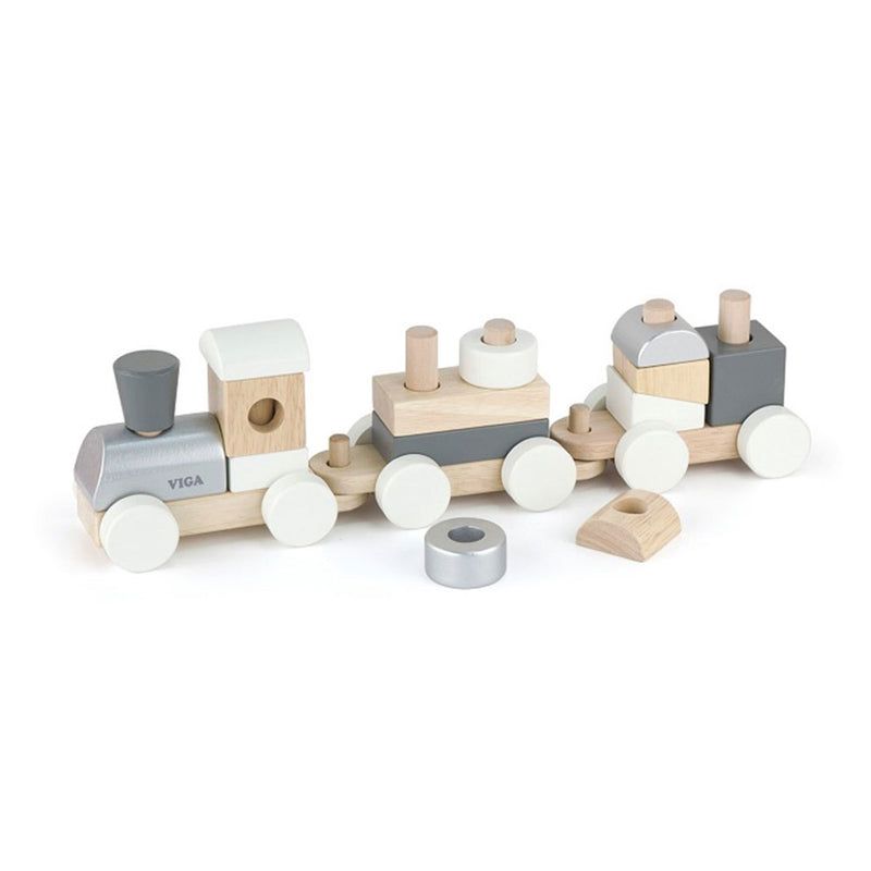 This stacking train from VIGA is made of high-quality beech wood, and designed in Scandinavian style. The 14 easy-to-grasp wooden blocks slot onto rods on the flatcars, providing a great opportunity to practice fine motor skills. For even more play value: The blocks can also be used for stacking, building& sorting, and the smooth-rolling train cars detach to shorten the train or let children play with it individually Size: 408 x 120 x 80 mm Safety: All Viga toys are made with non-toxic paints & inks and comply with EN71 & ASTM toy standards. Ages 18 Months +