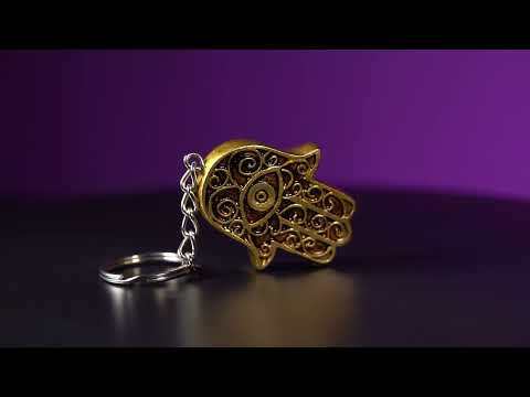 Porte-clés mystique à main hamsa peint à la main. Présente un design hamsa complexe avec une finition métallique sur un porte-clés traditionnel.