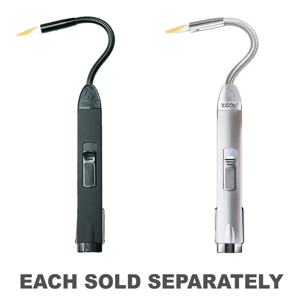 Le briquet de l'utilitaire extérieur du cou flexible Zippo est une construction plate en aluminium noir avec des inserts caoutchoutés. Technologie à double flamme résistante au vent. Le cou étendu flexible, surmonté d'une buse mince et puissante, correspond facilement à toutes les ouvertures d'éclairage. Système d'allumage avancé. Indicateur au niveau du carburant. Bouton de sécurité à la flamme à flamme réglable. Boucle suspendue en acier inoxydable. Idéal pour le camping, les lanternes, les cheminées, les torches tiki, les grilles, les feux de camp et plus encore. La forme du boîtier standard avec des coins arrondis et le dessus avec un fond plat. Une charnière à cinq barils rejoint le haut et le bas. Il a un insert standard avec 16 trous dans la cheminée (8 par côté). Le bas est estampillé avec le logo Zippo de la période authentifie ces briquets en tant que véritable Zippo.