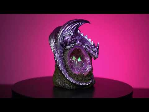 Brûleur d'encens magique à reflux représentant un dragon violet métallique enroulé autour d'une souche d'arbre. Une géode scintillante entoure trois cristaux proéminents. Sculpture et couleur détaillées. Les LED changeantes font de ce brûleur un bel ornement fonctionnel.