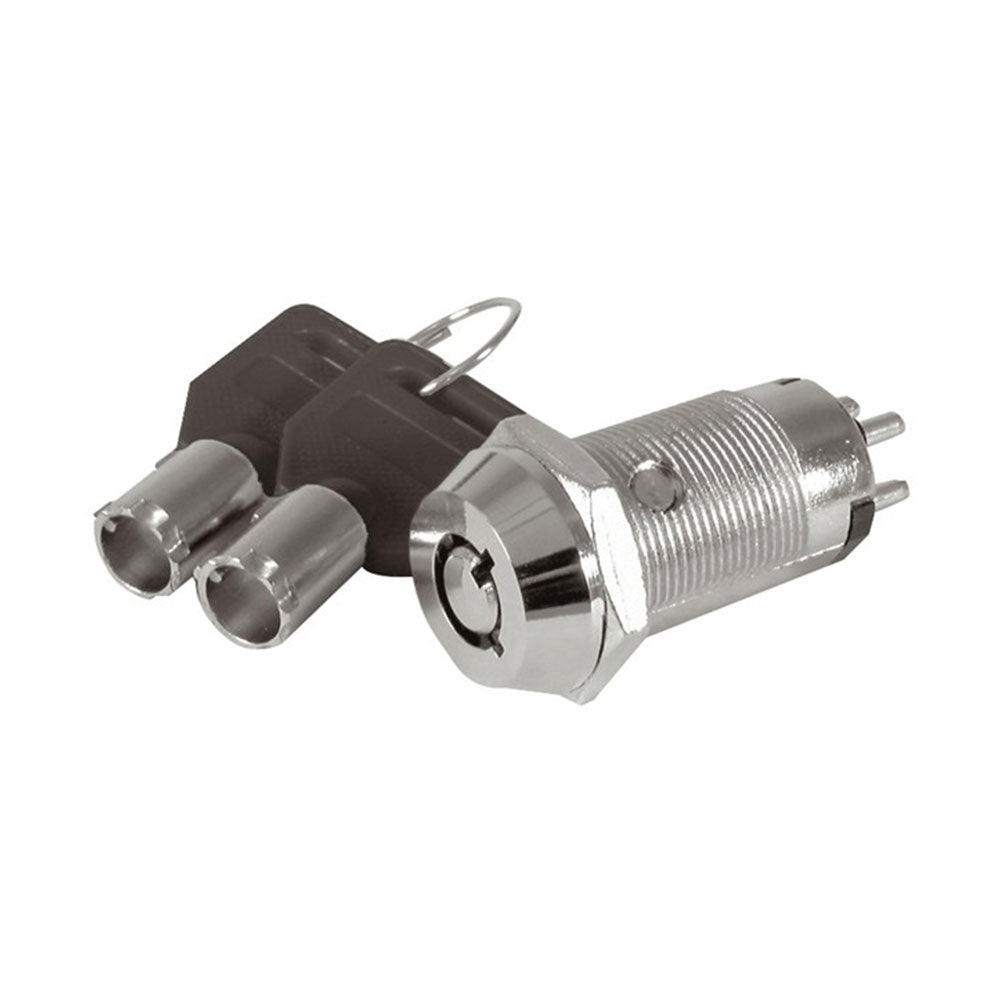 Ce commandant de touche utilise des clés tubulaires avec des inserts en plastique noir pour les identifier facilement. Il a 2 positions et la clé est amovible des deux. Il y a 4 bornes de connexion, cependant, ce n'est pas un interrupteur régulier à deux pôles (DPST), mais plutôt un interrupteur de changement à deux pôles à un seul pole (SPST) car chaque paire de contacts est à l'état opposé à l'autre .
