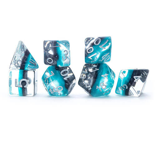 Midnight Black & Dreams of Teal - Numérotation argentée. Les dés Eclipse sont des dés superposés (4) comportant deux fines couches de couleur nacrée brillante nichées entre deux couches extérieures transparentes parfaitement claires !