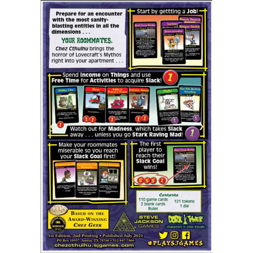 Préparez-vous à une rencontre avec les entités les plus dévastatrices de cette dimension ou de n'importe quelle dimension. . . vos colocataires. Chez Cthulhu combine le système classique Chez Geek avec le dieu aîné préféré de tous, intègre un nouveau mécanisme de folie et donne naissance contre nature à un jeu autonome conçu par Steve Jackson et illustré par John Kovalic.