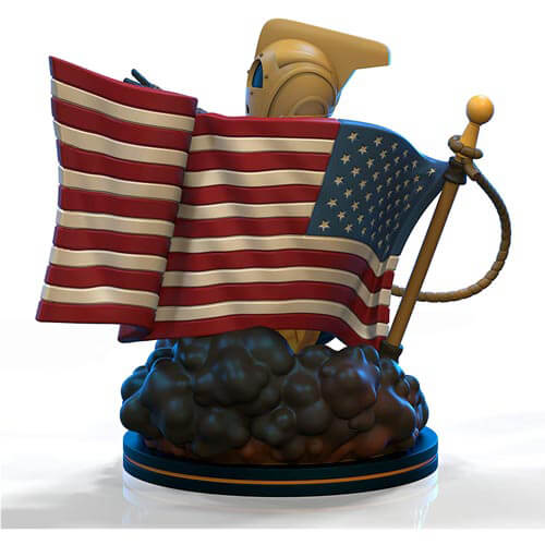 • Le Rocketeer Q-Fig Elite mesure 12,7 cm de haut depuis la base d'affichage du diorama enflammé jusqu'au sommet du drapeau américain flottant derrière notre héros.