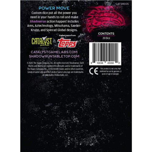 • Avec des logos d'entreprise spéciaux accompagnant les 5 et 6, une marque de pépin sur le 1 et un assortiment de couleurs, ces dés améliorent n'importe quel jeu Shadowrun et permettent d'en choisir facilement un à utiliser comme dé sauvage !