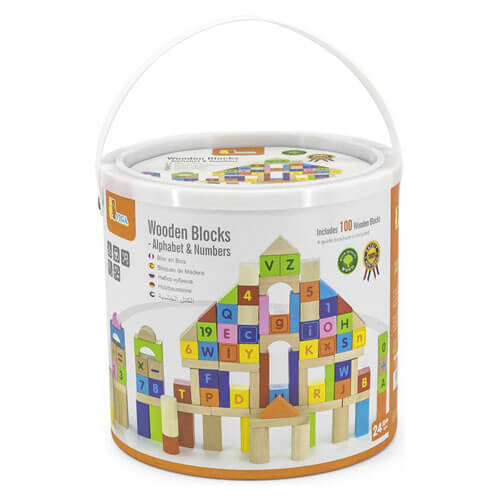 Beschikt over zowel natuurlijke als geschilderde blokken met hoofdletters, nummers en basisfuncties voor wiskunde. 100 stuks. Grootste blok meet 6 (w) cm.
