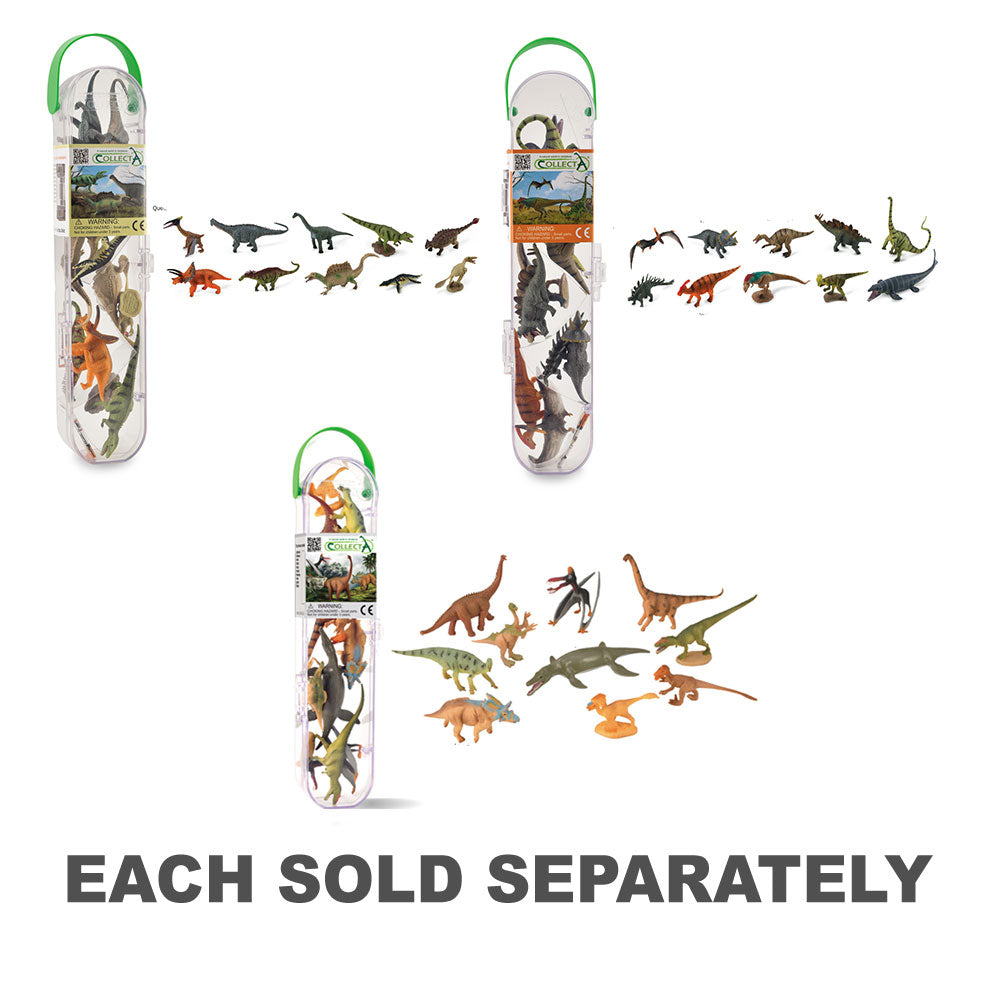 • Deze set van 10 mini -dinosaurussen in een duidelijke draagtas van Collecta omvat 1 van elk van de volgende dinosaurussen: Ankylosaurus, Apatosaurus, Velociraptor, Brachiosaurus, Liopleurodon, Giganotosaurus, Amargasaurus, Quetzalcoatlus, Torosaurus, Spinosaurus.