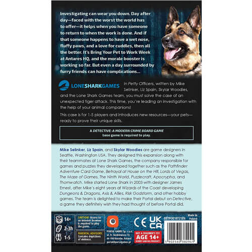 Soms heeft iedereen een pauze nodig, zelfs speciale agenten. Ze komen thuis met een wanhopige behoefte aan een knuffel. Vooral als het een knuffel is van iemand harig, met een vochtige neus en een kwispelende staart. Maar knuffels zijn niet hun enige specialiteit. Ze kunnen ook een strafrechtelijk onderzoek oplossen ... Petty Officers is een uitbreiding van de detective van de legendarische criminaliteitsbordspel door Ignacy Trzewiczek. De uitbreiding is geschreven door de beroemde Mike Selinker, samen met Liz Spanje, Skylar Woodies en het Lone Shark Games -team. Maar deze keer voegen huisdieren zich aan bij het onderzoeksteam van Antares!