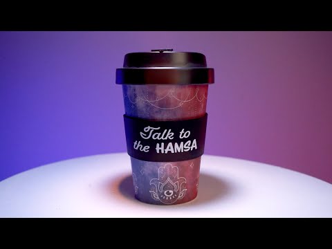 • Bijpassende zwarte anti-spill-deksel en beschermende siliconenband met punny-zin 'Praat met de Hamsa'.