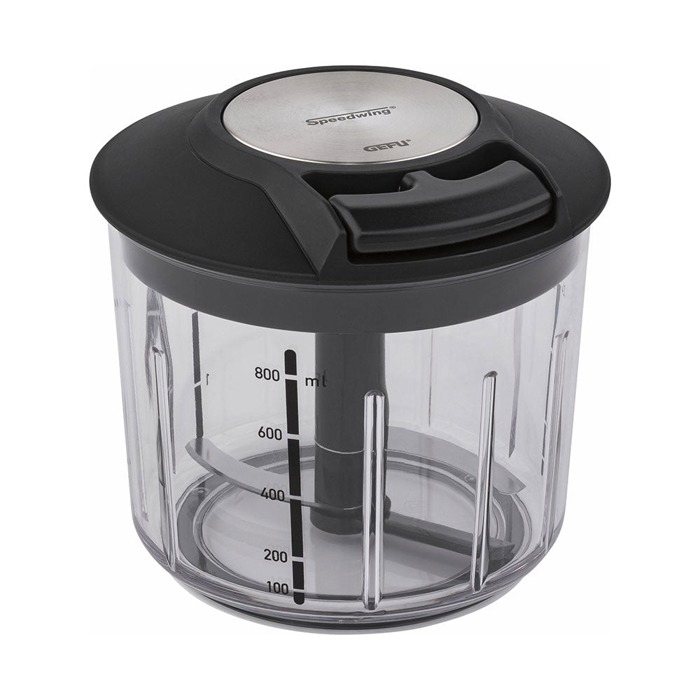 Efficiënt en inspanningsbesparende multi-salent: dankzij het pull-cord-mechanisme is het pletten, pureren, mengen, kloppen en roeren zeer verschillende ingrediënten het spel van kinderen en in een mum van tijd gedaan. Afhankelijk van de tijdsduur die het wordt gebruikt, kan het snijinslag wortelen, moeren en nog veel meer tot consistenties hakken, variërend van grof tot zeer fijn. Twee zeer scherpe, gebogen messen zorgen voor het optimale resultaat. Een ander inzetstuk kan worden gebruikt om romige spreads en aromatische saladedressings te produceren na bijvoorbeeld het drogen van de kruiden in de draaiende mand. De groeven in de container zorgen ervoor dat het gesneden voedsel altijd naar de basis wordt geleid. Een praktische schaal helpt u de ingrediënten te meten. Uitgebreide accessoires, zoals een opbergdeksel, worden geleverd met de transparante container gemaakt van stevig SAN -materiaal, dat een basisring heeft om het apparaat te allen tijde veilig te laten staan. Kenmerken: * Universeel toepasselijk en volledig zonder elektriciteit