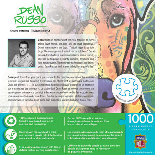 Deze meesterwerken 19.25 "x 26.75" Dean Russo 1000 -stuk puzzel is de perfecte mix van spannend en schattig. Dean Russo Art Studio heeft een oprechte toewijding aan dierenredding en heeft deelgenomen aan liefdadigheidsveilingen, donaties en fondsenwervende evenementen. Door inspirerende berichten en heldere afdrukken, zal het werk van Dean Russos zeker de dag opfleuren. Elke puzzel heeft extra grote stukken voor een leuke en snelle nacht van raadsel met de familie of groep vrienden. De EZ-griptechnologie die wordt gebruikt om deze puzzel te maken, biedt grotere puzzelstukjes die perfect samenkomen, zonder de beeldkwaliteit in gevaar te brengen. Om de impact op onze omgeving te verminderen, is de in deze puzzel gebruikte spaanplaat van gerecycled materiaal gemaakt.