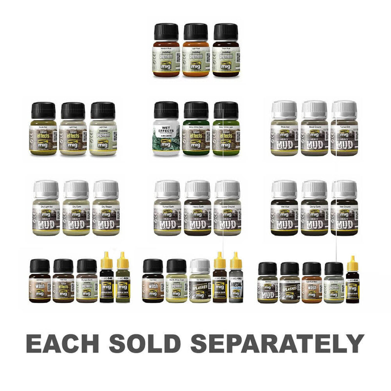 Essentiële verzameling producten zoals aarde texturen, correcte trackkleuren, evenals roest- en stofeffecten voor het schilderen van sporen in alle droge omgevingen. Creëer het unieke uiterlijk van stofopnames en slijtage die uniek zijn voor AFV's in droog droog terrein. Dergelijke harde en schurende omstandigheden creëren effecten van droge roest (A.MIG-1002), gepolijste metaalverbindingen (A.MIG-034, A.MIG-192) en de accumulatie van stof en verpulverde aarde (A.MIG-1751, A.MIG-3003) Alleen met deze all-inclusive multimedia Dry Earth Tracks Set. De set omvat 3 emailjaren 35 ml en 2 acrylpotten 17 ml: