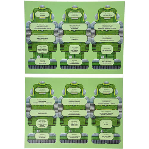- De robot bestaat uit vijf tegels, één tegel met regels voor elke fase plus een speciale vaardigheid, die de robot tijdens het spel gebruikt.