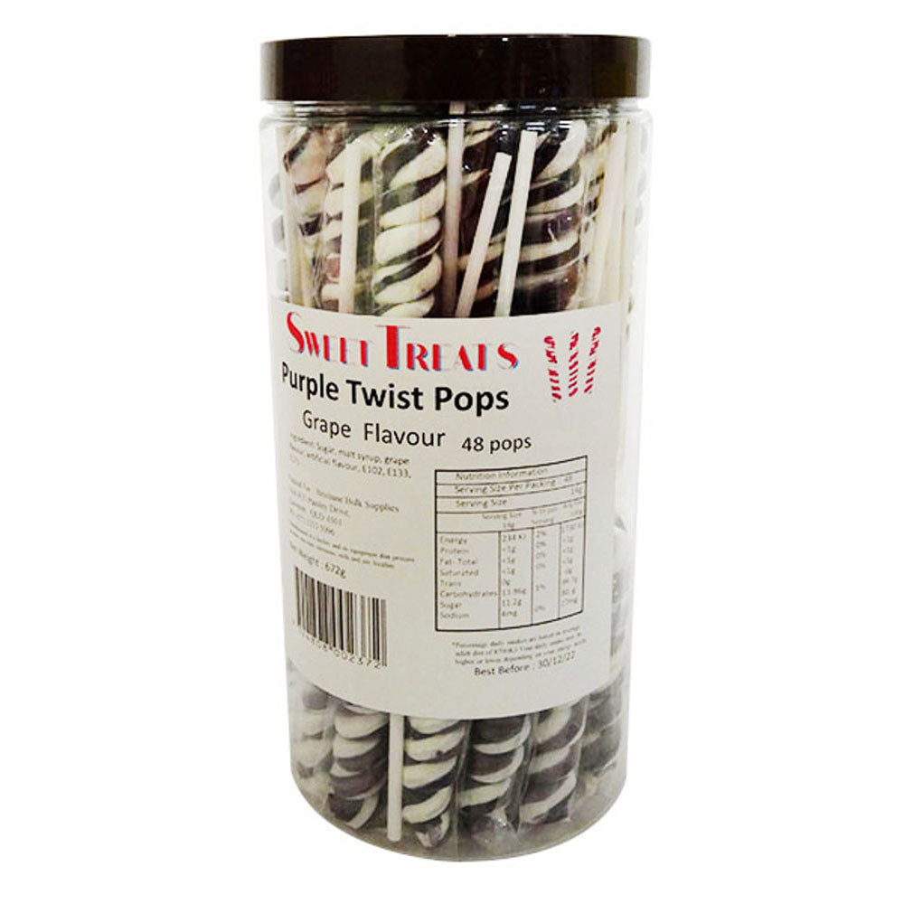 Elke pop heeft een werveling van paars en wit, waardoor een betoverend patroon ontstaat dat zo mooi als lekker is. Of je nu een speciale gelegenheid viert of gewoon zin hebt in een uitbarsting van smaak, Twist Pops belooft een suikerachtige ervaring die je dag zeker zal opvrolijken. Geniet van de wervelingen van zoetheid en geniet van een vleugje vreugde met elke lik.